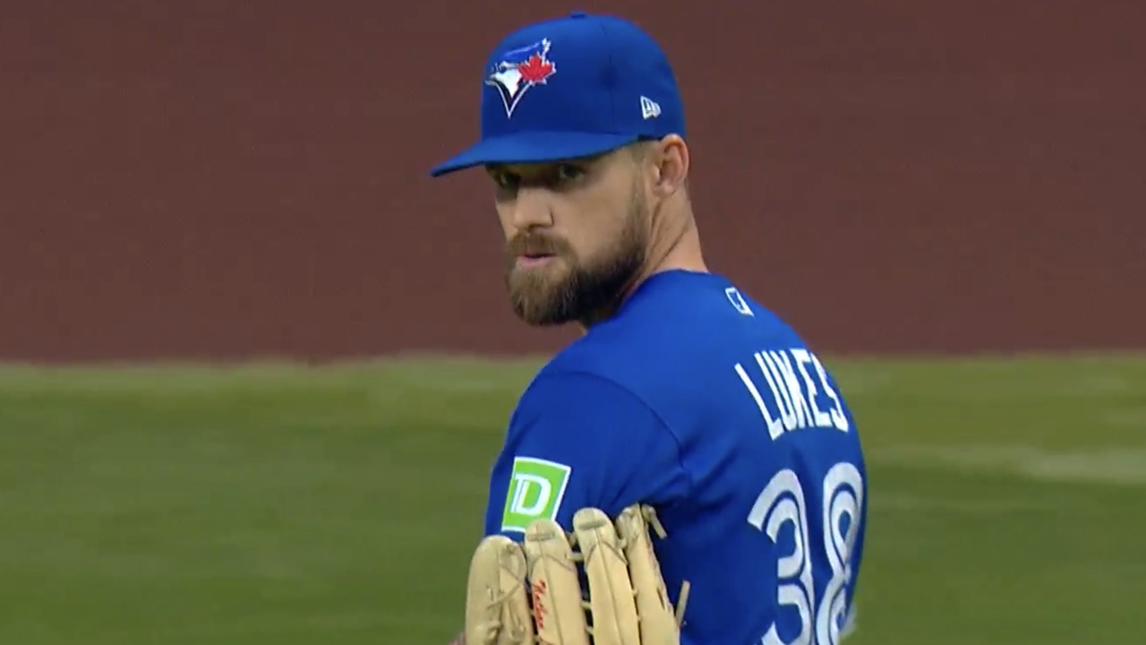 Blue Jays’ Lukes throws out Perdomo at second base from right field